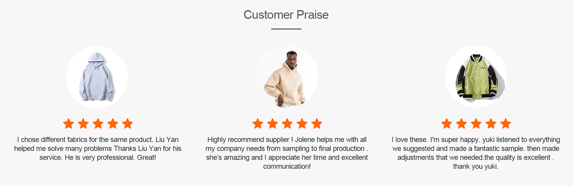 In light of the foregoing, if you wish to gain a better understanding of our manufacturing process, we will arrange for a senior manager to provide you with consulting services, including relevant product knowledge regarding fabrics, materials, logos, and labels. In terms of garment production, we employ professional quality inspectors who ensure the consistency of the product's quality. In terms of transportation, we also have a fast, secure, and efficient logistics department that will arrange shipment for you, ensuring that your products arrive safely and on time. As a clothing supplier, our goal is to provide you with high-quality products that will enable you to grow your business quickly.